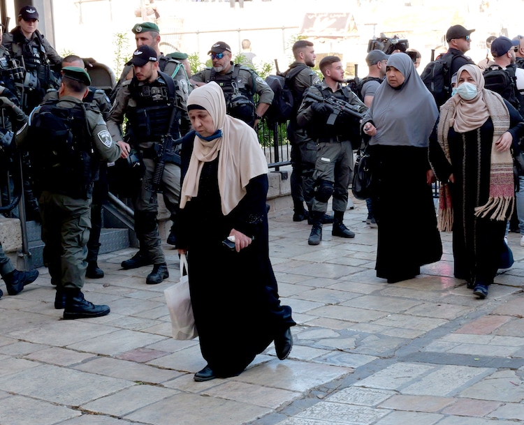 (Michael Stack | Special to The Tribune) Israeli police and soldiers stand guard at the entrance of the Muslim section of East Jerusalem on Friday, April 15, 2022.