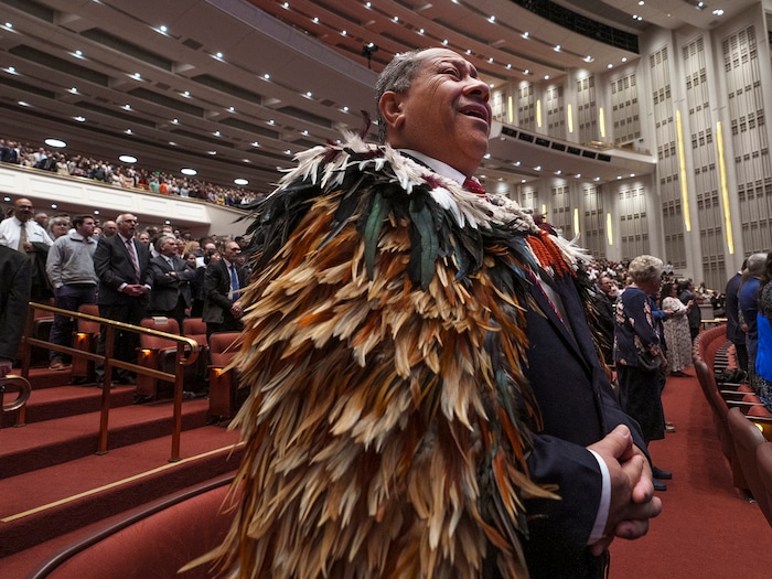 (Leah Hogsten | The Salt Lake Tribune) Dr. Ash Puriri of New Zealand, dressed in a sacred Maori cloak, sings with fellow members of The Church of Jesus Christ of Latter-day Saints during the morning session of General Conference on Saturday, April 1, 2023.