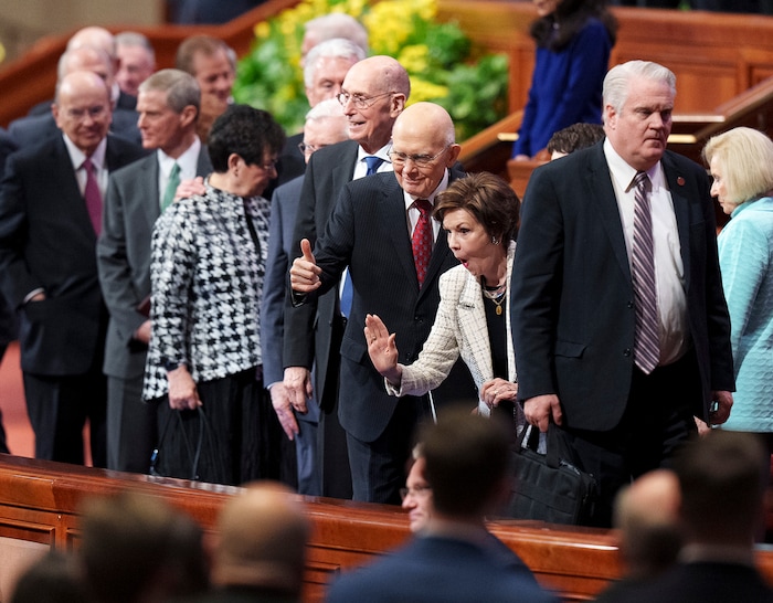 (Leah Hogsten | The Salt Lake Tribune) The Church of Jesus Christ of Latter-day Saints President Dallin H. Oaks and his wife, Kristen, wave to friends as they leave the morning session of General Conference on Saturday, April 1, 2023.