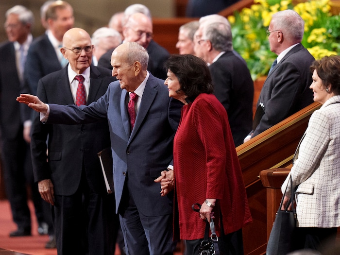 (Leah Hogsten | The Salt Lake Tribune) Russell M. Nelson, 98, leaves the morning session of General Conference with his wife Wendy on Saturday, April 1, 2023. Nelson is the oldest prophet-president in The Church of Jesus Christ of Latter-day Saints' 193-year history.