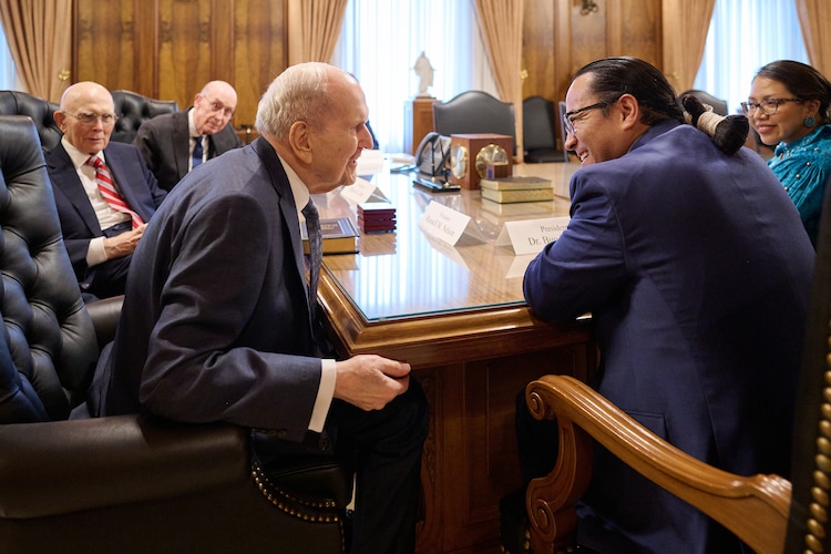 (The Church of Jesus Christ of Latter-day Saints) President Russell M. Nelson speaks with Navajo Nation President Buu Nygren during a visit in the Church Administration Building on Thursday, Feb. 15, 2024.