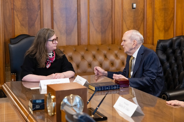 (The Church of Jesus Christ of Latter-day Saints) President Russell M. Nelson speaks with Bergdís Ellertsdóttir, Iceland's ambassador to the United States, in Salt Lake City on Thursday, Jan. 18, 2024.