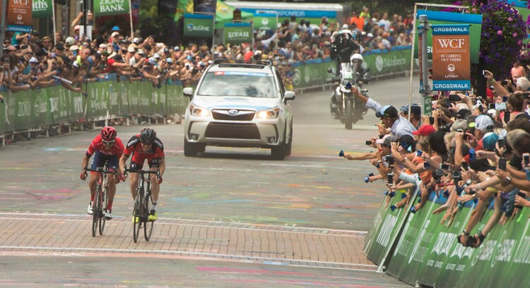 Rick Egan | The Salt Lake Tribune Lachlan Norris and Brent Bookwalter are neck and neck on the final climb up Park City's Main Street, in Tour of Utah Stage 7, competition Sunday, August 9, 2015. Norris edged out Bookwalter to win the stage.