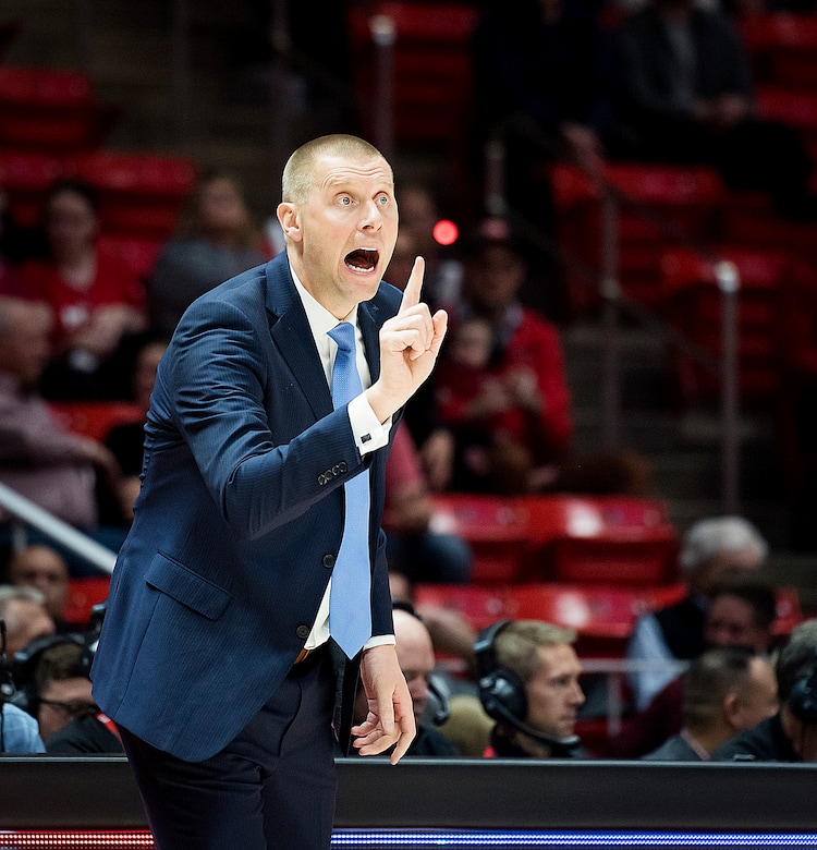 (Michael Mangum | Special to The Tribune) Brigham Young Cougars head coach Mark Pope yells to his team during their game against the Utah Utes at the Huntsman Center in Salt Lake City on Wednesday, Dec. 4, 2019.