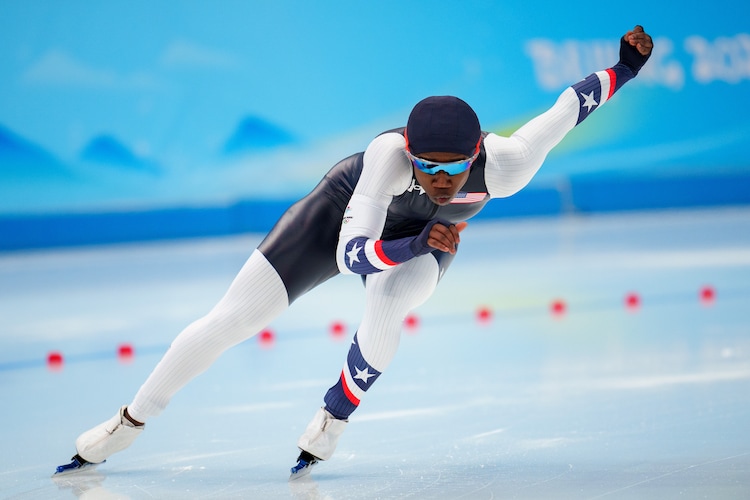 (Trent Nelson | The Salt Lake Tribune) Erin Jackson (USA) wins the gold medal in the speedskating women's 500m at the 2022 Winter Olympics in Beijing on Sunday, Feb. 13, 2022.