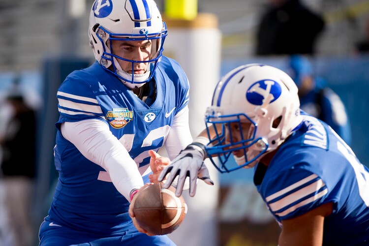 (Jeremy Harmon | The Salt Lake Tribune) Brigham Young Cougars quarterback Tanner Mangum (12) and Brigham Young Cougars running back Tyler Allgeier (45) warm up as BYU gets ready to face the Western Michigan Broncos in the Famous Idaho Potato Bowl in Boise, Idaho, on Friday, Dec. 21, 2018.