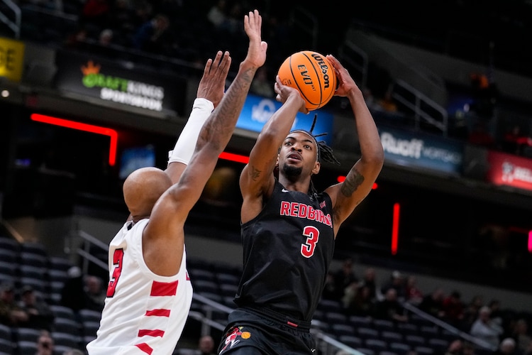 Illinois State guard Seneca Knight (3) shoots over Ball State forward Mickey Pearson Jr. (3) in the first half of an NCAA college basketball game in Indianapolis, Saturday, Dec. 17, 2022. (AP Photo/Michael Conroy)