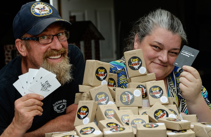 (Francisco Kjolseth | The Salt Lake Tribune) Dang You to Heck, billed as a family-friendly, Utah-themed alternative to Cards Against Humanity and other NSFW card games is the creation of Jerilyn Pool, of Provo, with an assist from her husband Jeff as they assemble themed collections at their home on Thursday, Aug. 3, 2018.