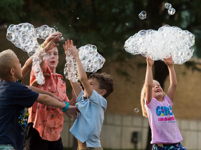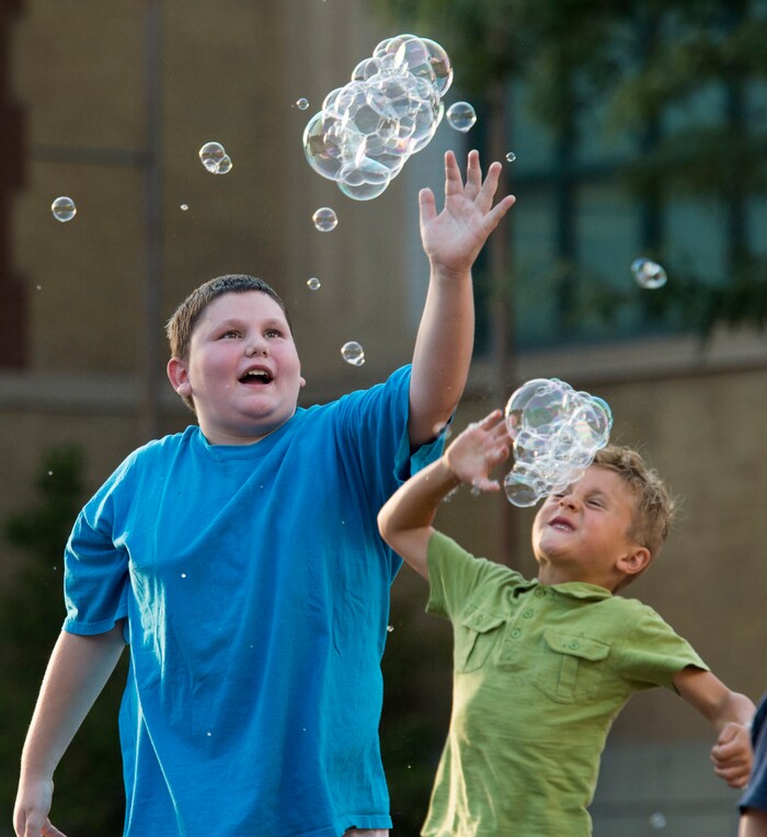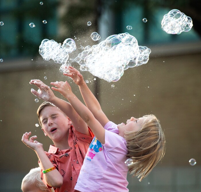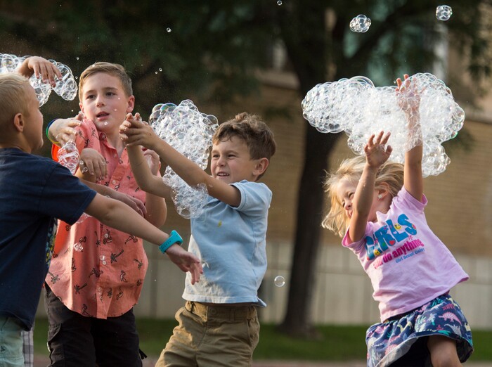 (Rick Egan | The Salt Lake Tribune) Kids chase bubbles as they fall from the bubble tower at the Utah State Fair, Thursday, Sept. 6, 2018.