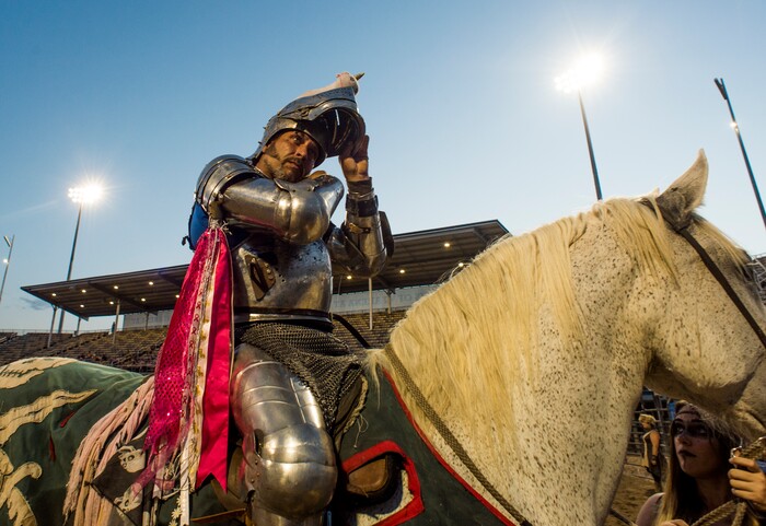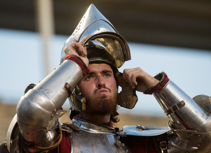 (Rick Egan | The Salt Lake Tribune) Eddie the "Hit Man” Rigney prepares for the Knights of Mayhem jousting competition, at the Utah State Fair, Thursday, Sept. 6, 2018.