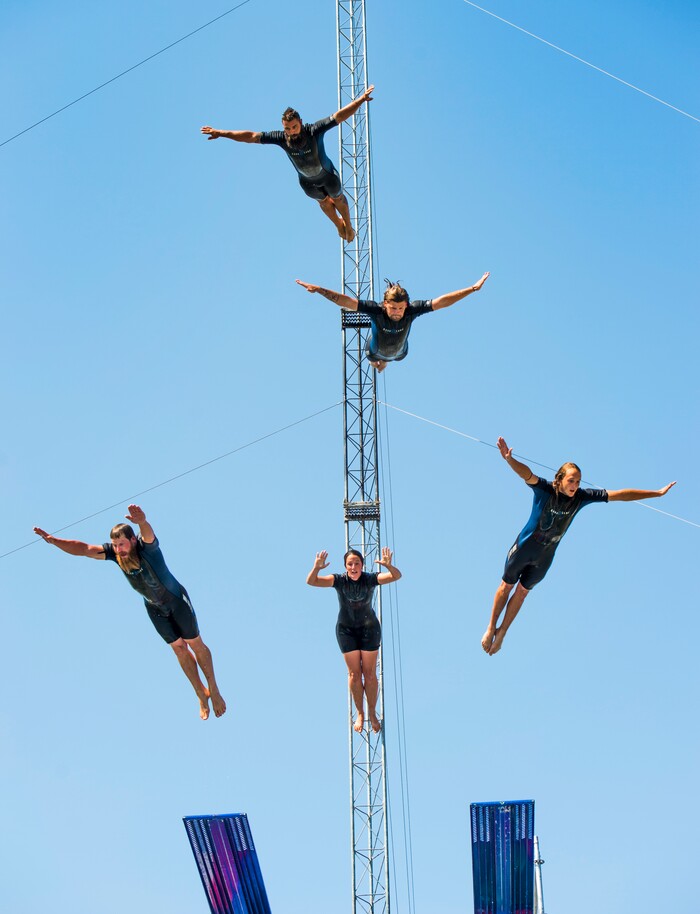 (Rick Egan | The Salt Lake Tribune) Five divers from the Flying Fools High Dive show, dive into a 10-foot pool of water at the same time, on opening day of the Utah State Fair, Thursday, Sept. 6, 2018.