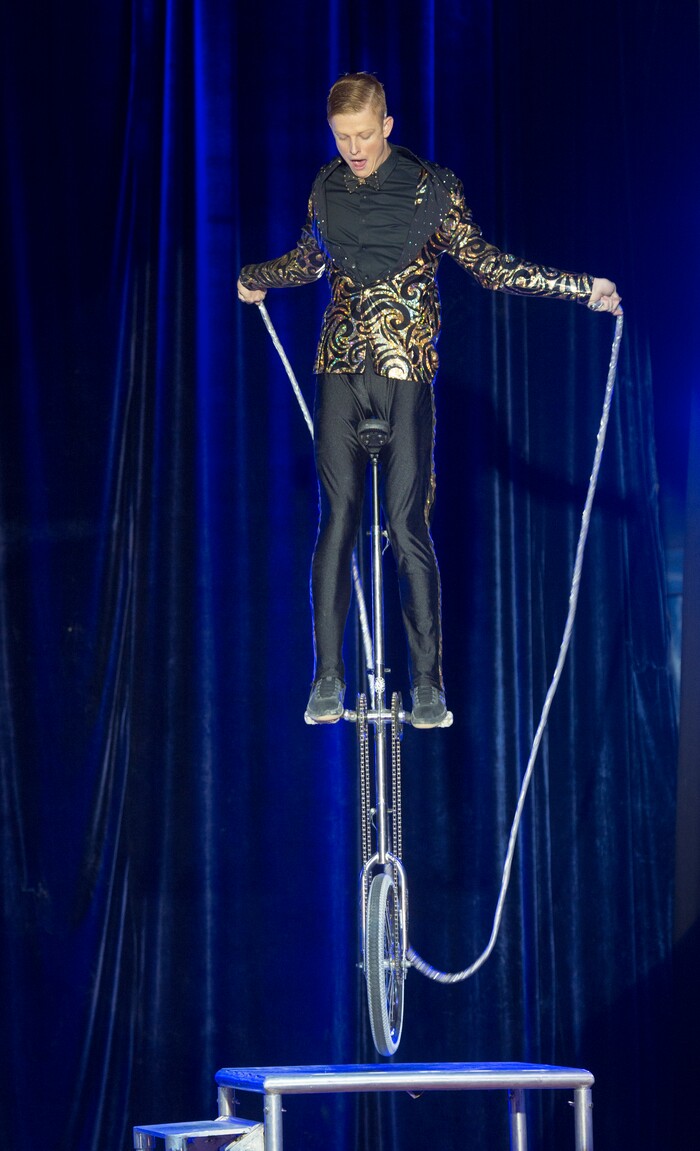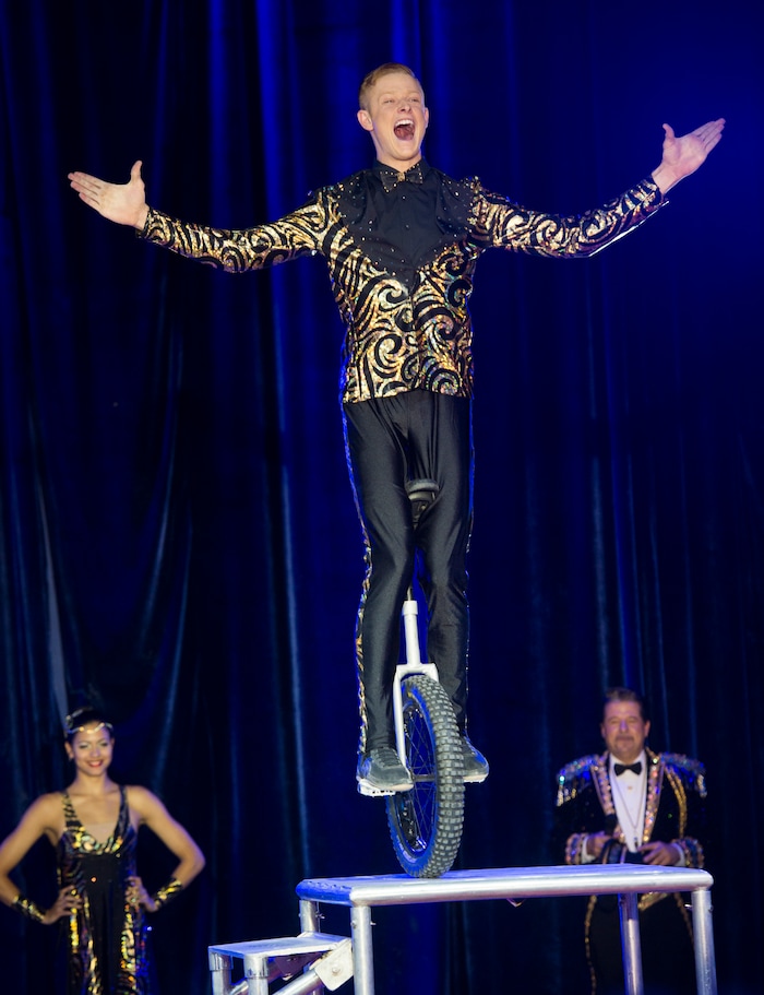 (Rick Egan | The Salt Lake Tribune) Americas one wheel wonder, Wesley Williams, jumps rope on a unicycle in the Big Top Circus Spectacular, on opening day of the Utah State Fair, Thursday, Sept. 6, 2018.