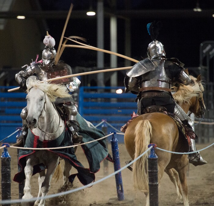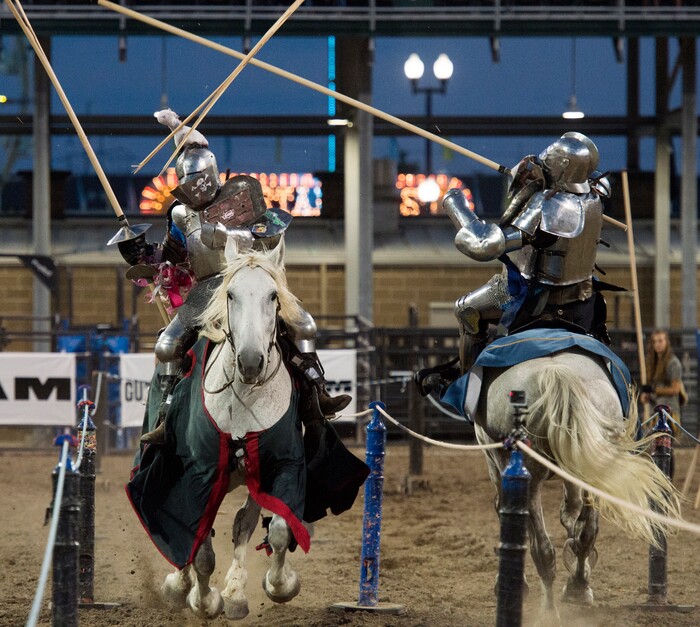 (Rick Egan | The Salt Lake Tribune) Charlie Andrews competes against Eddie the "Hit Man” Rigney in the Knights of Mayhem jousting competition, at the Utah State Fair, Thursday, Sept. 6, 2018.