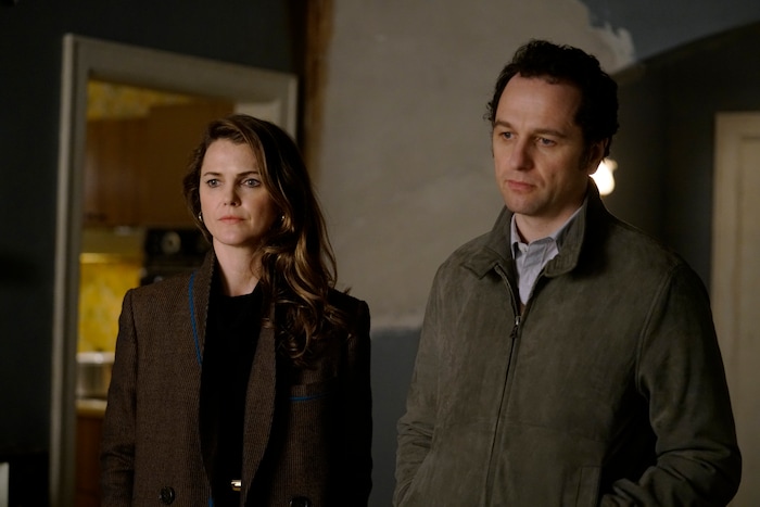This image released by FX shows Keri Russell, left, and Matthew Rhys in a scene from "The Americans." For its fifth season, this thriller about Russian spies posing as 1980s-era all-American couple took an illuminating look at the American Dream while gaining unsought relevance as the Cold War of that distant age is bestirring anew. (Patrick Harbron/FX via AP)