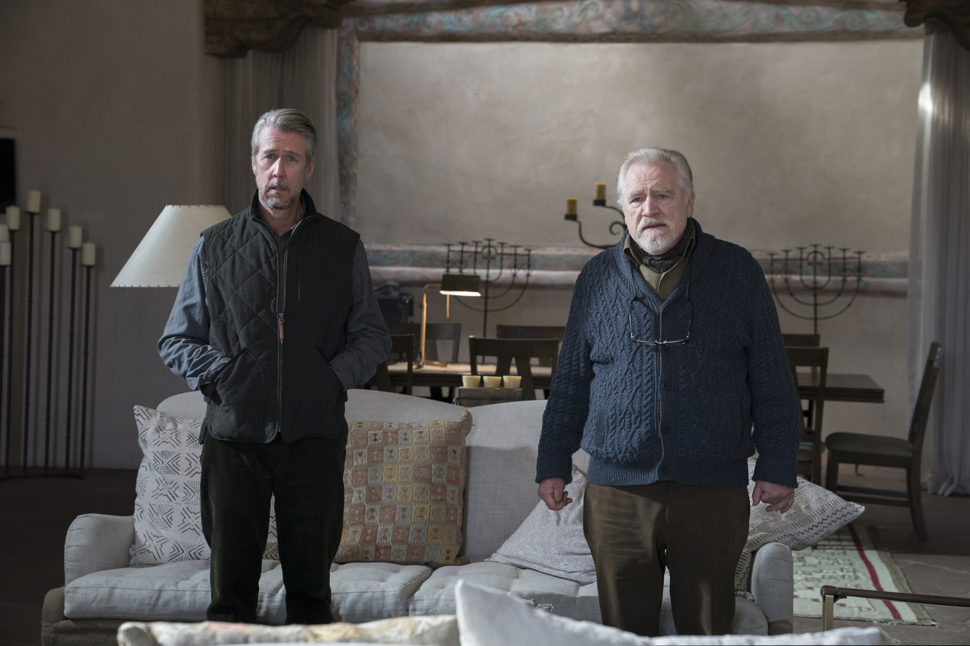 This image released by HBO shows Alan Ruck, left, and Brian Cox in a scene from "Succession." The program was named one of the top 10 TV shows of 2018 by the Associated Press. (Ursula Coyote/HBO via AP)