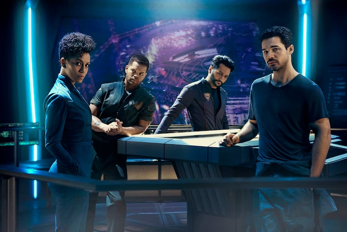 ( Kurt Iswarienko | Syfy ) Dominique Tipper as Naomi Nagata, Wes Chatham as Amos Burton, Cas Anvar as Alex Kamal, and Steven Strait as James Holden in "The Expanse."
