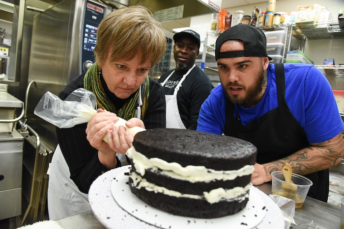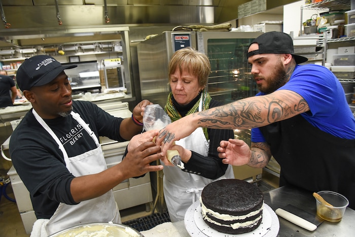 (Francisco Kjolseth | The Salt Lake Tribune) Actress Betsy West gets a little guidance preparing a frosting bag to work on a cake from chef's Frederick Jackson, left, and A.J. Collette as she prepares for an upcoming role of a Southern Baptist bakery owner in North Carolina faced with a request to bake a cake for a gay couple getting married for Salt Lake Acting Company's production of "The Cake." A self admitted baking novice, West, in search of better authenticity in portraying her role received a one-on-one lesson from the chef's at Flourish.