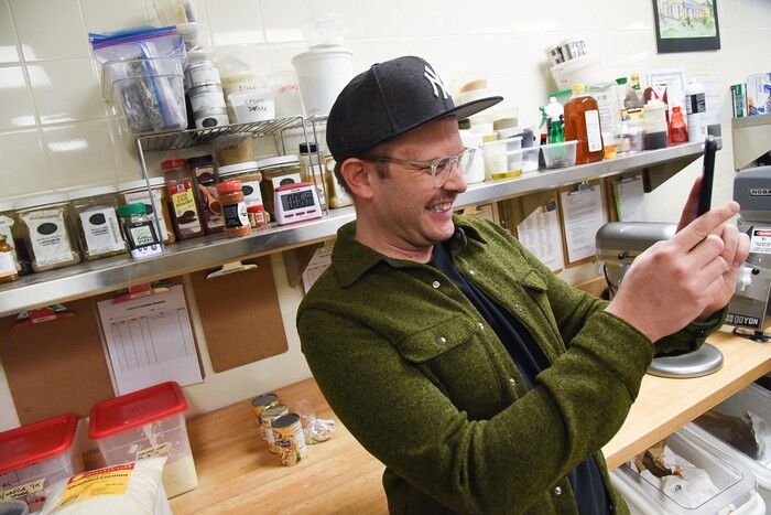(Francisco Kjolseth | The Salt Lake Tribune) Joshua Black, Director of Communications at Salt Lake Acting Company smiles as he documents actress Betsy West learning how to frost a cake as she prepares for an upcoming role of a Southern Baptist bakery owner in North Carolina faced with a request to bake a cake for a gay couple getting married for SLAC'S production of "The Cake." A self admitted baking novice, West, in search of better authenticity in portraying her role received a one-on-one lesson from the chef's at Flourish Bakery.