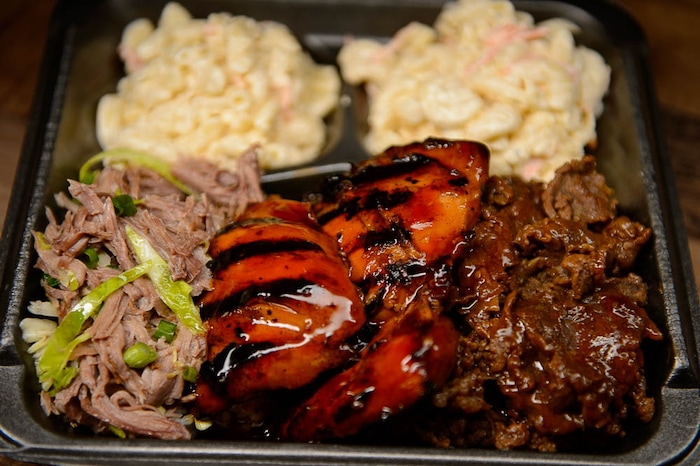 (Trent Nelson | The Salt Lake Tribune) Three-meat combination plate — teriyaki steak, teriyaki chicken and Kalua pork, at Sagato Bakery and Cafe, a new Polynesian eatery in Midvale.