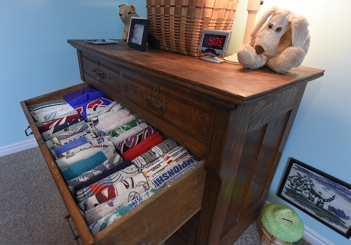 In her bedroom, she opens a drawer, and it’s a picture-perfect example of the KonMari Method — two rows of tri-folded shirts and hoodies, organized in vertical stands for added access and visibility. There’s a jacket from the 1995 Nordic World Ski Championships; a tee from the third Springer Tournee competition held in Park City.