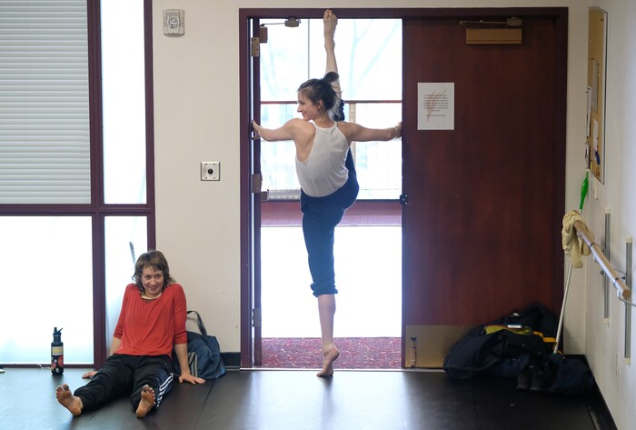(Francisco Kjolseth | The Salt Lake Tribune) Dancers Breeanne Saxton, left, and Megan McCarthy take a brief break while working with choreographer Stephen Koester, a Professor as well as Chair in the Department of Modern Dance at the University of Utah.