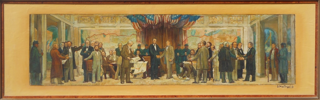 The panels appear to be studies for future murals, but the images — one of Lincoln shaking hands with railroad magnate Leland Stanford to seal the deal to build the transcontinental railroad, the other of the construction of the causeway over the Great Salt Lake — don’t appear in other McQuarrie murals. His work can be found in train stations in Houston; Mesa, Ariz.; and in Sacramento, San Jose, Palo Alto and Salinas in California.