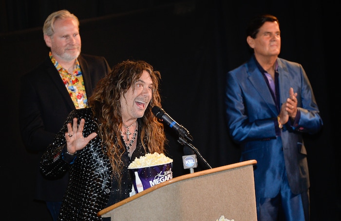 (Francisco Kjolseth | The Salt Lake Tribune) Voice actor Jess Harnell, center, joins producers Dan Farr, left, and Bryan Brandenburg as they take the spotlight for FanX's twice-annual "press conference," which draws cosplayers to Megaplex Jordan Commons in Sandy on Wed. June 12, 2019, for the announcement of the event's celebrity visitors.