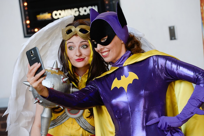 (Francisco Kjolseth | The Salt Lake Tribune) Mother and daughter superhero duo Ruth Barnum, left, and Bekcy Barnum join the fun for FanX's twice-annual "press conference," drawing cosplayers to Megaplex Jordan Commons in Sandy on Wed. June 12, 2019, for the announcement of the event's celebrity visitors.