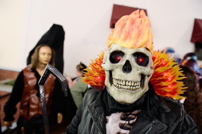 (Francisco Kjolseth | The Salt Lake Tribune) Eric Allan as Ghostrider has a little fun with his costume chain as he joins FanX's twice-annual "press conference," drawing cosplayers to Megaplex Jordan Commons in Sandy on Wed. June 12, 2019, for the announcement of the event's celebrity visitors.