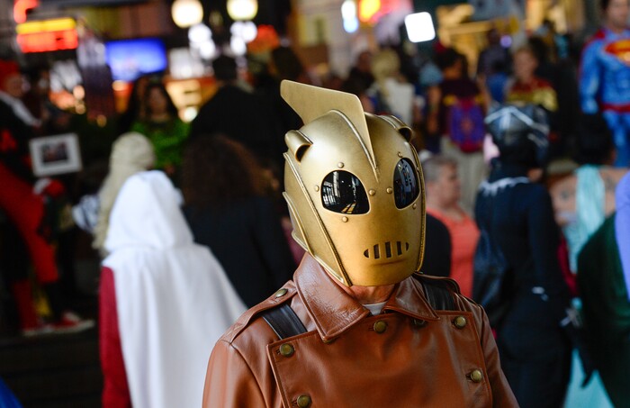 (Francisco Kjolseth | The Salt Lake Tribune) Bill Love as the Rocketeer joins FanX's twice-annual "press conference," drawing cosplayers to Megaplex Jordan Commons in Sandy on Wed. June 12, 2019, for the announcement of the event's celebrity visitors.