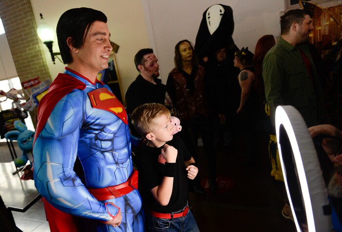 (Francisco Kjolseth | The Salt Lake Tribune) Matt Raines and his son Andon, 10, pose for a photograph during FanX's twice-annual "press conference," drawing cosplayers to Megaplex Jordan Commons in Sandy on Wed. June 12, 2019, for the announcement of the event's celebrity visitors.