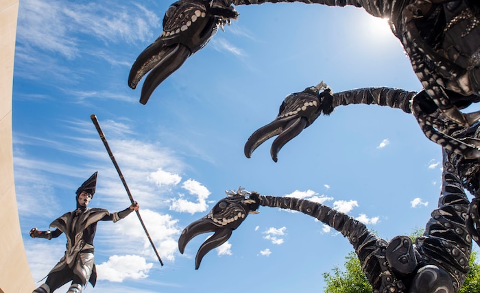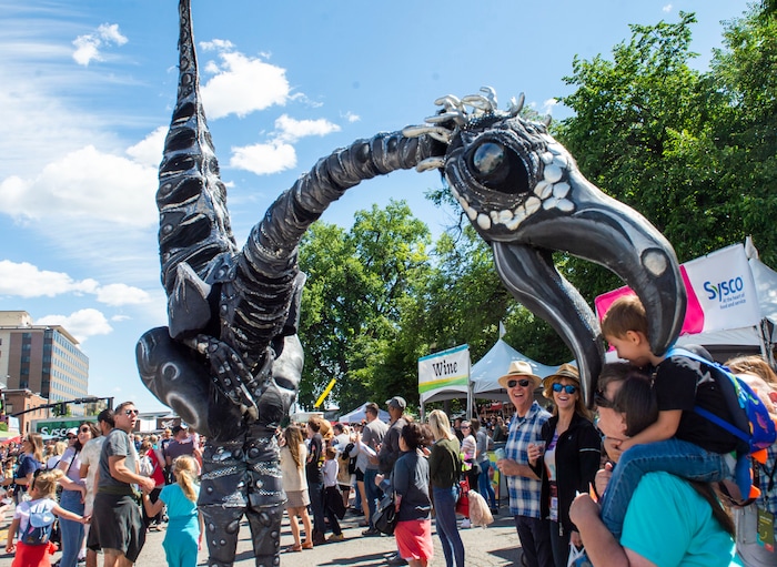 (Rick Egan | The Salt Lake Tribune) The A Sauruse goes after one of the kits, as it wanders the Utah Arts Festival, Saturday, June 22, 2019.