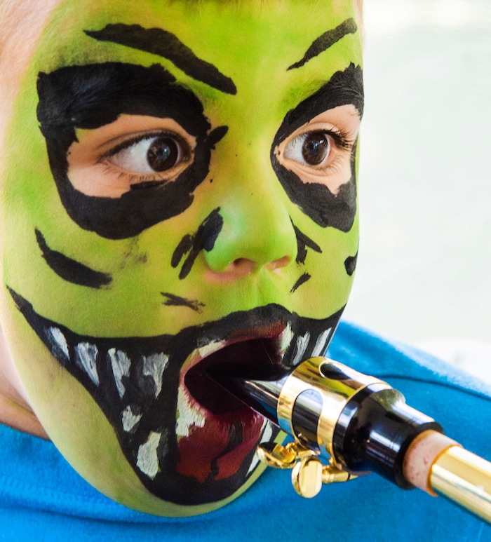 (Rick Egan | The Salt Lake Tribune) Hendrix Ford, 5, toots on a trombone in the Art Yard, at the Utah Arts Festival, Saturday, June 22, 2019.
