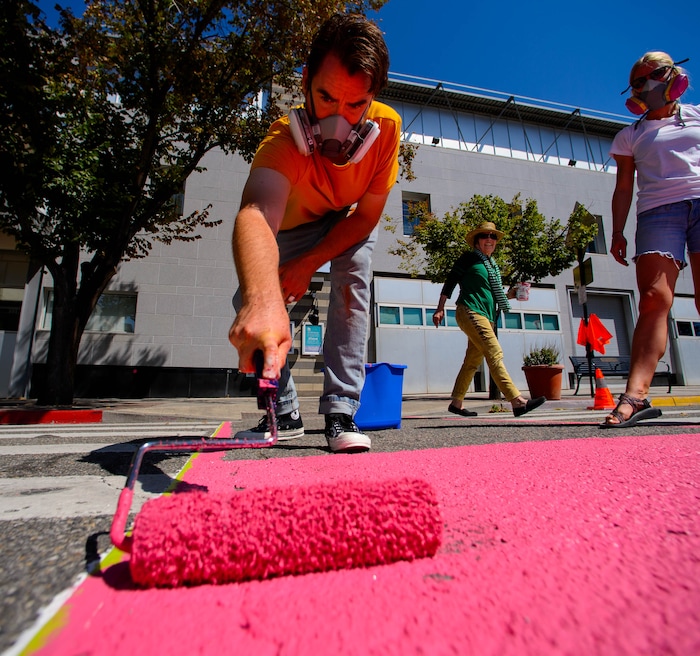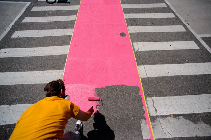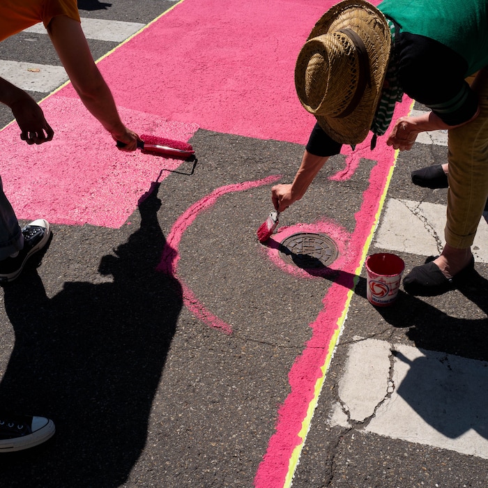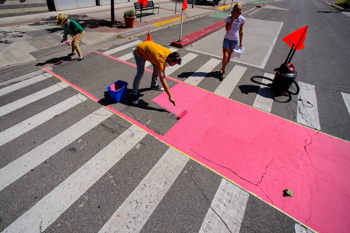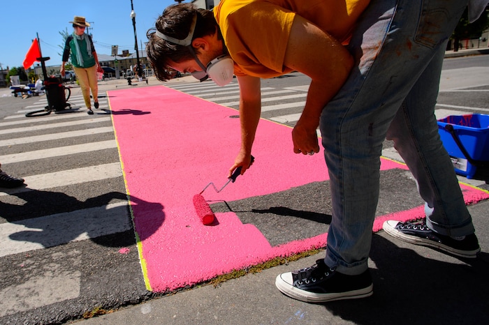 Haworth and her crew spent a recent Sunday morning rolling out magenta paint on asphalt, then adding a layer of tiny glass beads — “This is more like ground glass; it’s really terrifying,” she said — then pressing another roller over it to make sure the beads embed themselves in the paint.