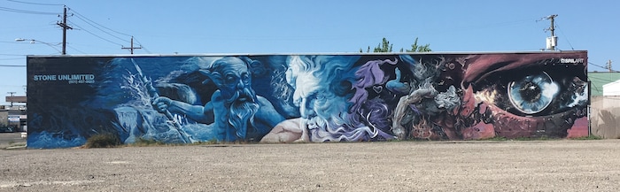 For artists like Shae Petersen, one appeal of murals is their size. Petersen, who’s based in Salt Lake City but works around the country under the tag SRILART, created two of the most massive murals in the Salt Lake area. Both feature Greek gods: “Atlas,” a five-story-tall mural at the Hardware Apartments near West High School; and “Zeus,” a 100-foot-wide work on the side of the Stone Unlimited building on 300 West just off 3300 South.