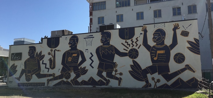 Another player in defining downtown Salt Lake City’s mural landscape, Brewer said, is the Utah Jazz. The National Basketball Association franchise commissioned two major murals last season: One, by South African artist Karabo Poppy, on the side of Valter’s Osteria on 300 South near 200 West; the other, Salt Lake City artist Trent Call’s history-laden “40 Seasons,” on Main Street near the Zions Bank at 100 South.
