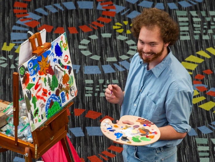 (Rick Egan | The Salt Lake Tribune) Will King as Bob Ross, assists 5-year-old Willow Worthington as Tinkerbell, as she paints on the opening day of Fan X Comic Convention at the Salt Palace in Salt Lake City, Thursday, Sept. 5, 2019.
