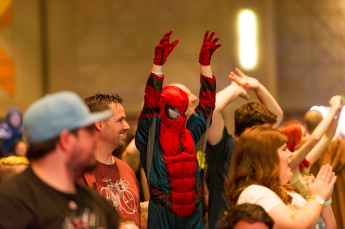 (Alex Gallivan | Special to Salt Lake Tribune ) A cosplaying fan in the FanX Salt Lake Comic Convention crowd attending an appearance by Spider-Man actor Tom Holland on Saturday, Sept. 7, 2019, at the Salt Palace Convention Center.