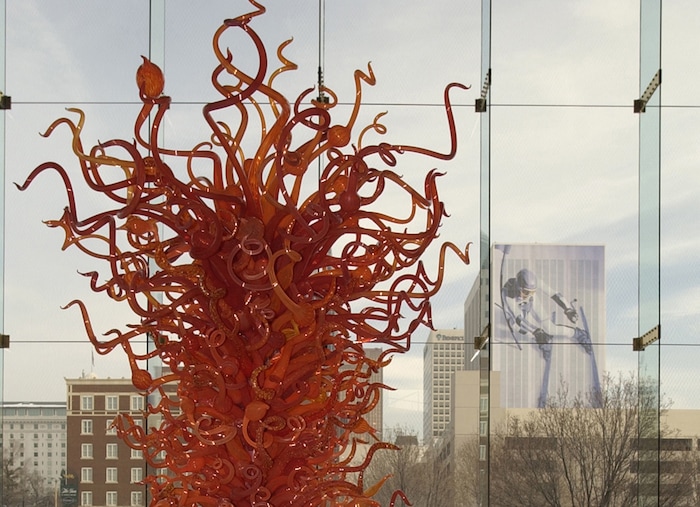Since 2001, the lobby has been home to a towering 27-foot high glass sculpture by Dale Chihuly, made up of 1,276 pieces of hand-blown, red, orange and yellow glass and inspired by the Olympic flame.