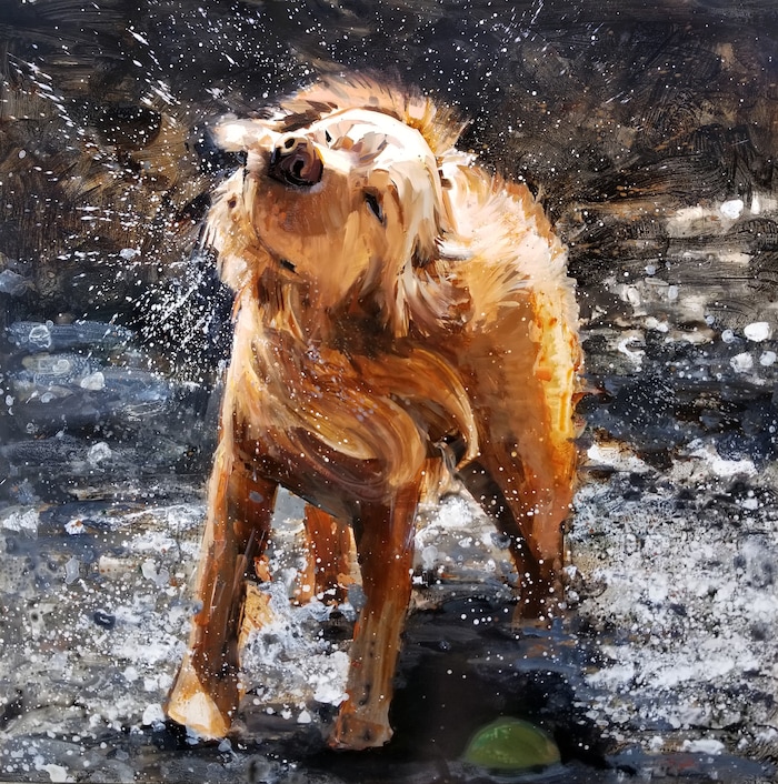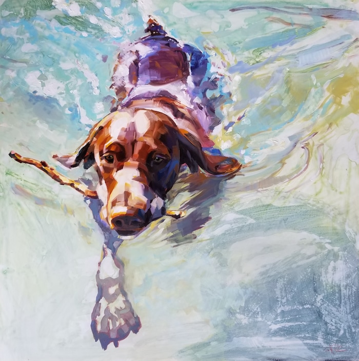 That’s particularly true when she paints water — often with dogs splashing around in it. “I don’t even have to think how to paint water. It just happens,” Harper said. “My artist friends call me a water witch. They’re like, ‘How do you do it?’”