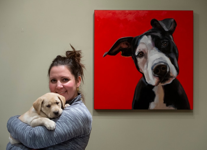 She plans to start painting the new dog immediately. She took a picture of the puppy and her brothers and sisters “that I know I’m going to paint. It’s going to be a puppy pile, and her face is looking right at you. And she’s darling.”