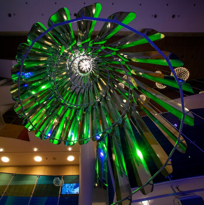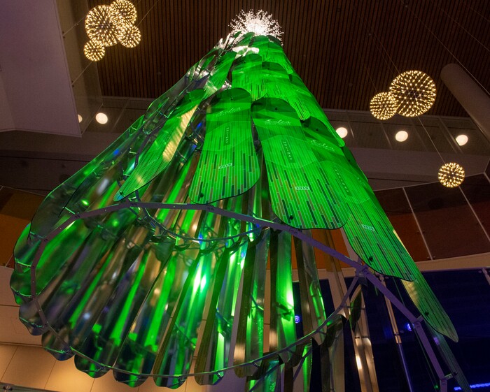 The Beishlines designed 75 snowboard figures, made from aluminum-laminated plastic, each cut to a precise size to encircle a spiral aluminum frame with 90 custom-made armature pieces. Shelley Beishline said they would have loved to have recycled old snowboards, but weight limitations for the tree, suspended over the Eccles lobby, made that unworkable.