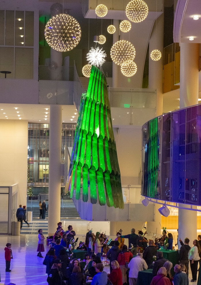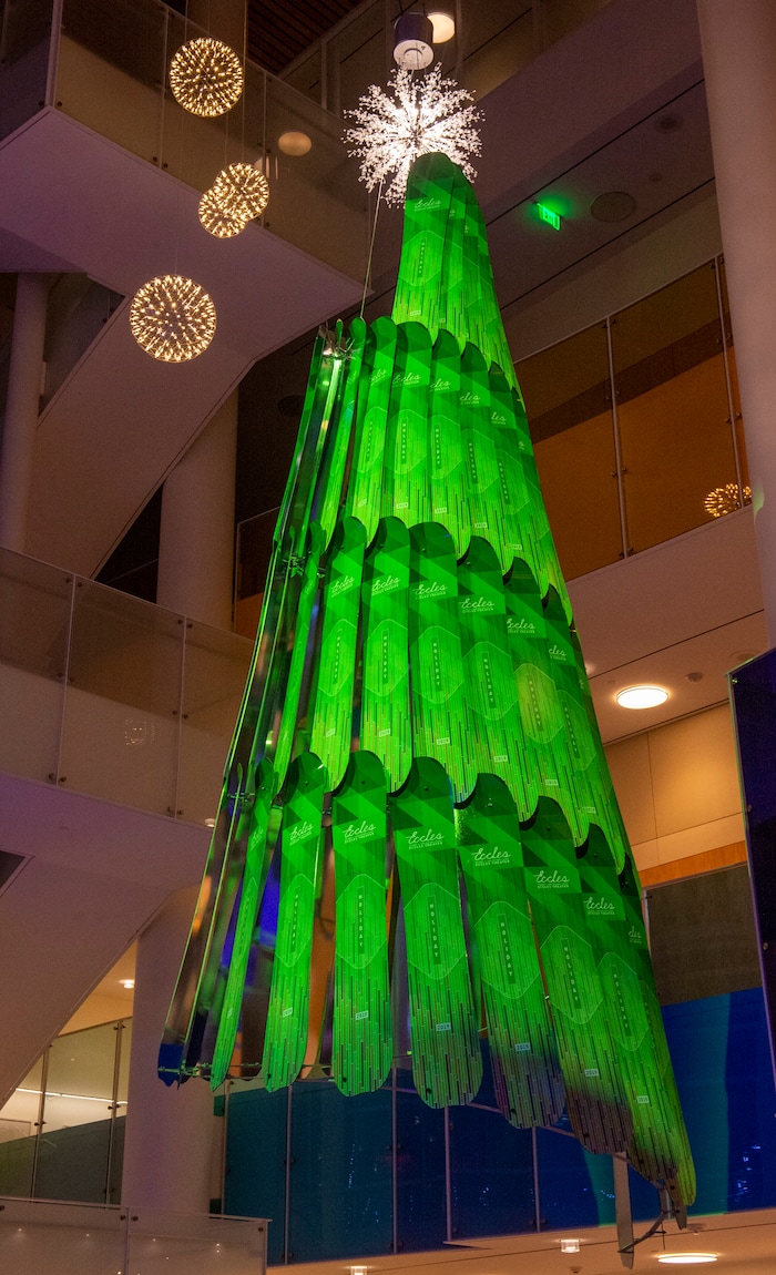 Hanging this year’s holiday tree in the Eccles Theater lobby required imagination, thoughts about nature and Utah’s winter sports, some math and engineering skills, a nod to personal tradition, and about nine months’ effort.