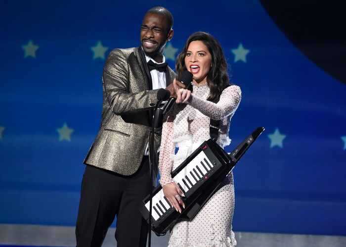 (Chris Pizzello | Invision/AP) Comedian Jay Pharoah, left, with Olivia Munn at the 2018 Critics Choice Awards in Santa Monica, Calif., will appear at the 2020 Sundance Film Festival to promote the movie "Bad Hair."