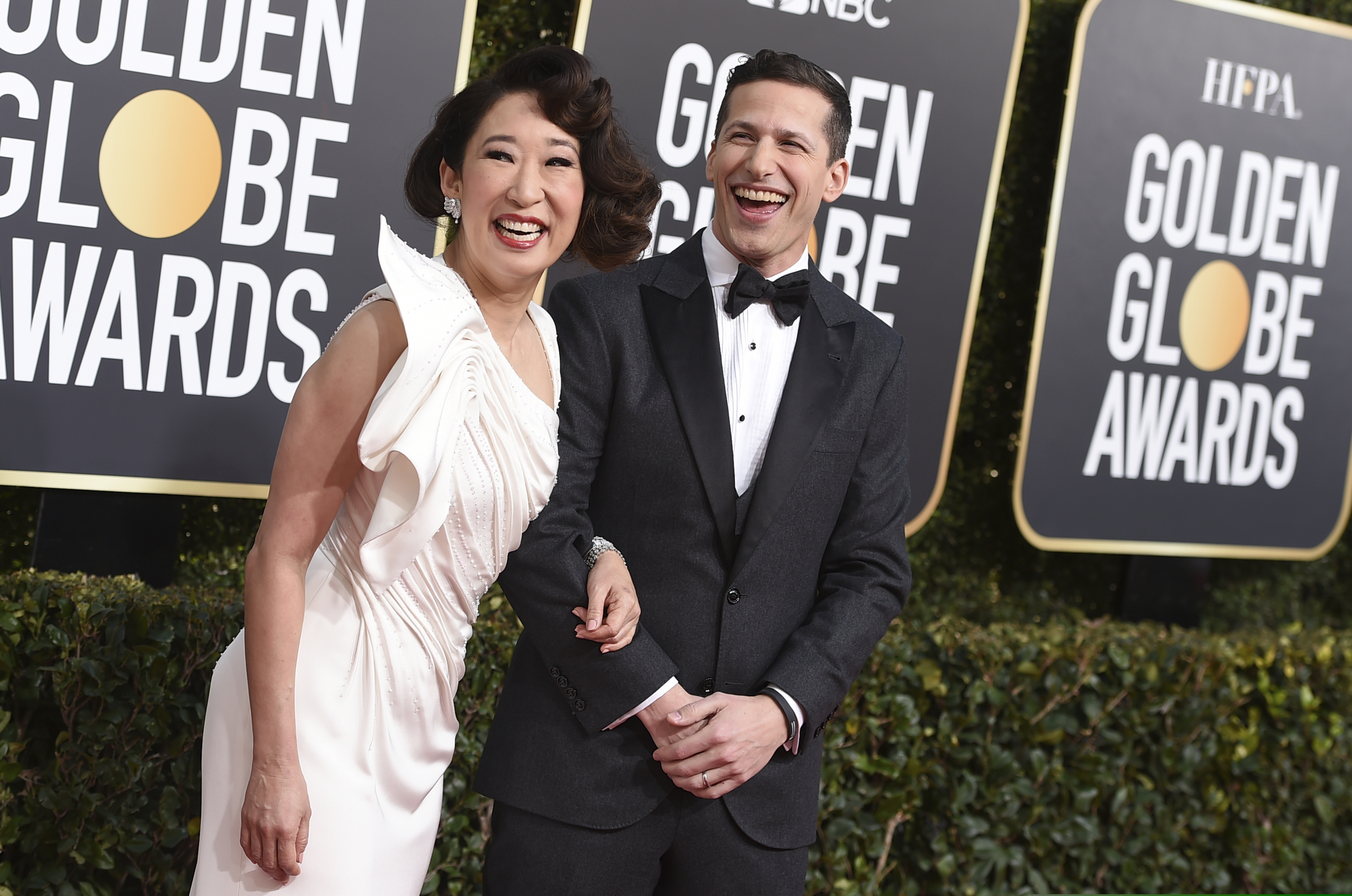 (Jordan Strauss | Invision/AP) Andy Samberg, right, seen here with 2019 Golden Globes co-host Sandra Oh, will appear at the 2020 Sundance Film Festival to promote the movie "Palm Springs."