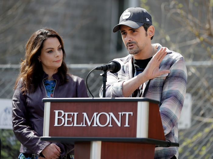 (Mark Humphrey | AP) Kimberly Williams Paisley, left — seen here with her husband, country music star Brad Paisley at the April 2019 groundbreaking ceremony for The Store, a free grocery store for people in need in Nashville, Tenn., will appear at the 2020 Sundance Film Festival at The Creative Coalition gala.