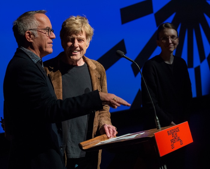 (Rick Egan | The Salt Lake Tribune) Sundance Film Festival director John Cooper and Founder Robert Redford, welcome the crowd to Opening night film of the 2020 Sundance Film Festival, "Crip Camp", at the Eccles Theatre in Park City, Thursday, Jan. 23, 2020.