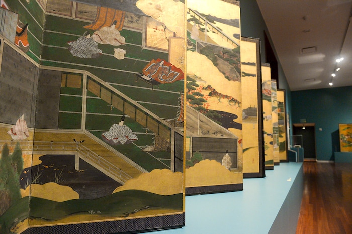 Two screens in the exhibit depict scenes from “The Tale of Genji,” a 40,000-line poem from the 11th century about an emperor’s son who is demoted to commoner. Screens with “Genji” images were often given as wedding presents, Kelly said.