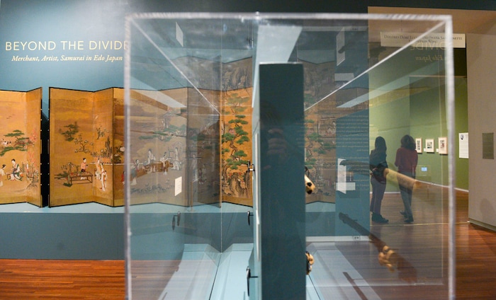 They are laid flat in a display case, “to reflect the way the Japanese of the Edo period would look at these pieces, that they were beautiful objects, but they would not have the same pride of place as a screen or a painting,” said Luke Kelly, UMFA’s associate curator of collections and antiquities, and curator of the “Beyond the Divide” exhibition.