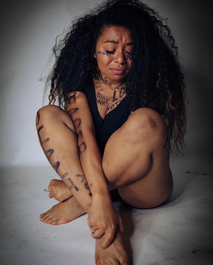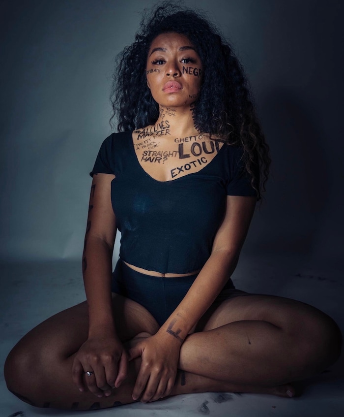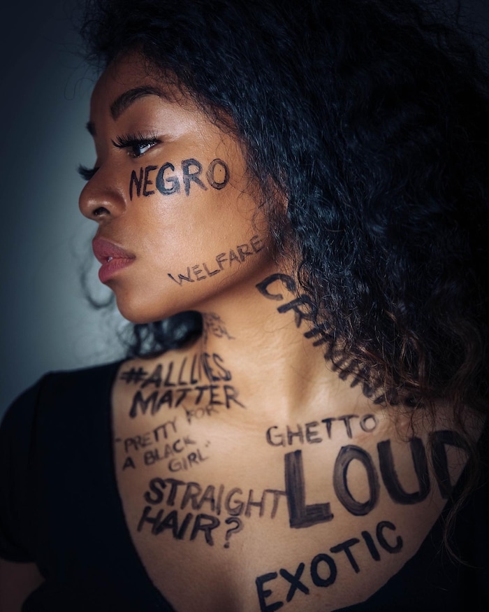Ana Brown, who photographed Lake and six other friends, wanted to capture both the frustrations black women are feeling and the way they would like to be portrayed. She took photos of Lake covered in the negative stereotypes used to describe black women, and she also took pictures with the women covered in positive words.